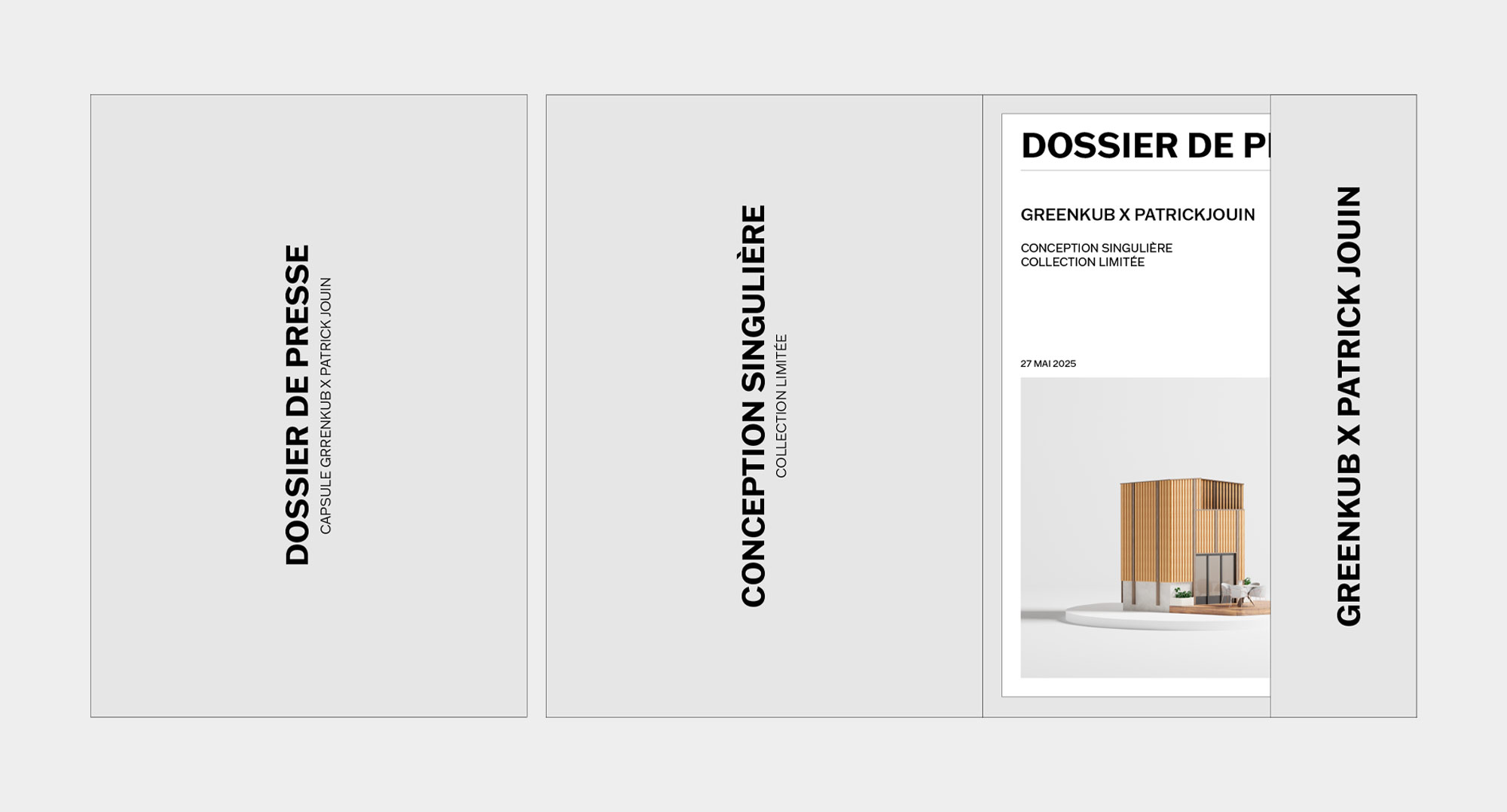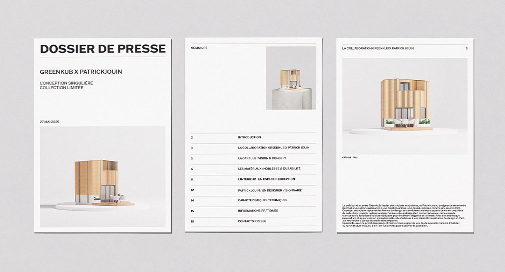 Pensé comme un objet en soi, le dossier de presse GreenKub x Patrick Jouin adopte les codes du luxe et de l’art. Format allongé, pochette dépliante, esthétique minimaliste : chaque détail évoque une invitation à découvrir une œuvre exclusive. À l’image d’une plaque de musée, le dossier présente la capsule comme une création architecturale rare. Plus qu’un support d’information, ce dossier affirme le positionnement de GreenKub dans l’univers de l’architecture haut de gamme et inscrit la collaboration comme une référence durable du design contemporain.