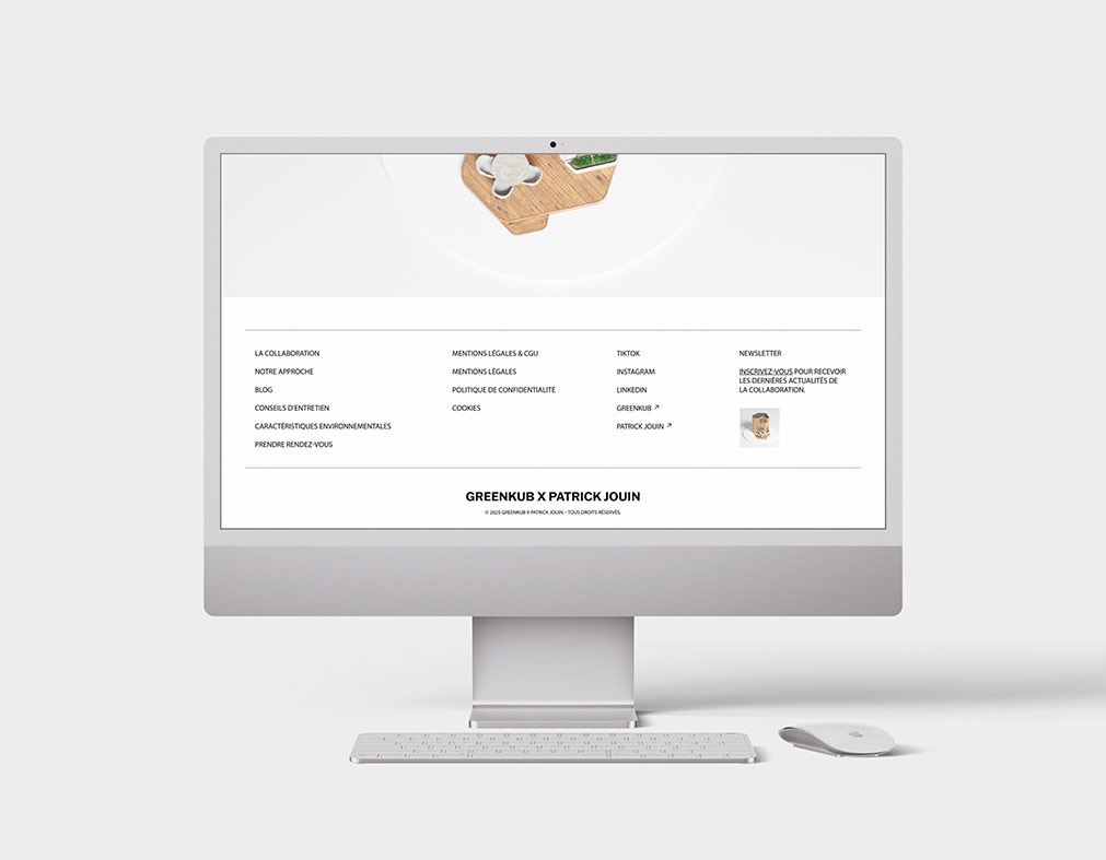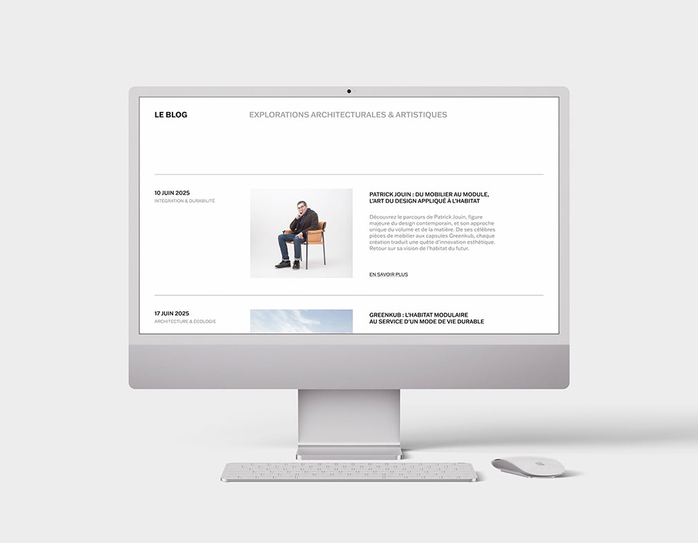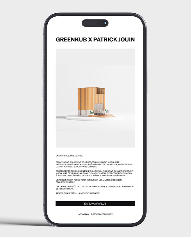 Sur le site et les réseaux sociaux, la collaboration GreenKub x Patrick Jouin s’exprime à travers un univers éditorial épuré et immersif. Fond blanc, visuels pleine largeur : la capsule est mise en lumière comme une œuvre d’art. Le site web, enrichi d’une rubrique dédiée et d’un blog éditorial, affirme l’expertise de GreenKub tout en renforçant sa visibilité.