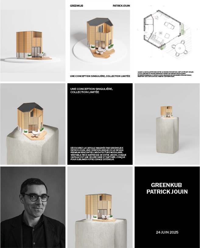 GreenKub s’associe à Patrick Jouin pour donner naissance à une capsule d’exception, à la croisée de l’architecture, du design et de l’art de vivre. Cette collaboration unique repousse les frontières de l’habitat modulaire en l’inscrivant dans un univers résolument haut de gamme. Leader français des studios de jardin modulaires, GreenKub apporte son savoir-faire industriel, écologique et clé en main. Patrick Jouin, designer français de renom, insuffle sa vision : des lignes justes, une esthétique intemporelle et une exigence absolue du détail. Ensemble, ils imaginent un espace de vie où la fonctionnalité rencontre l’élégance, où chaque mètre carré est pensé comme une œuvre. Plus qu’un habitat, cette capsule est une pièce de collection. Une architecture sobre et minimaliste, conçue pour magnifier l’espace, la lumière et les usages. GreenKub x Patrick Jouin incarne une nouvelle vision du luxe accessible : durable, intelligent et profondément contemporain.